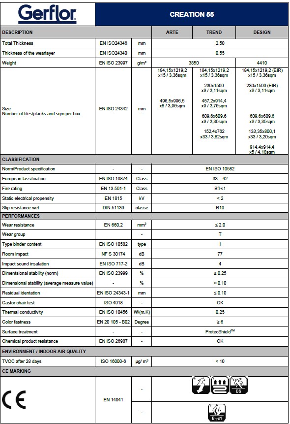 Η νέα συλλογή Creation 55 της Gerflor, εμπνευσμένη από τις τελευταίες τάσεις του interior design, συνδυάζει αποχρώσεις και νερά ξύλου προσεκτικά επιλεγμένα για απόλυτη αρμονία στον χώρο. Με 71 ολοκαίνουργια σχέδια και μοτίβα, σας προσφέρει αμέτρητες δυνατότητες συνδυασμών μέσα στον ίδιο χώρο. Όψεις ξύλου, ψαροκόκαλου, σεβρόν, πέτρας και μαρμάρου δημιουργούν μια πλούσια γκάμα επιλογών — είναι βέβαιο ότι θα βρείτε τον ιδανικό κωδικό που ταιριάζει στο δικό σας έργο. Με συνολικό πάχος μόλις 2,5 mm, η συλλογή είναι κατάλληλη ακόμη και για έντονη επαγγελματική χρήση (κατηγορία 33/42). Παράλληλα, προσφέρει τη μεγαλύτερη ποικιλία διαστάσεων σε βινυλικές λωρίδες και πλακίδια, καλύπτοντας κάθε σχεδιαστική και λειτουργική ανάγκη.